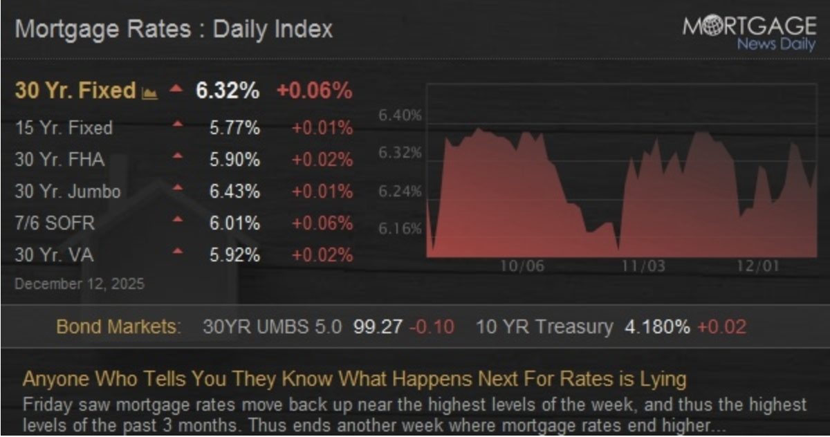 This week proved that point again. Even after a Federal Reserve rate cut, mortgage rates moved higher and finished near their highest levels of the past three months. That is because Federal Reserve policy and mortgage rates are not the same. The Fed controls very short-term lending, while mortgage rates are tied to long-term markets that react daily to economic data.